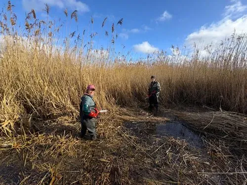 Winter activities include cutting and removing Reed from shallow areas to maintain open water for birds and dragonflies, sustain a greater variety of plant species and reduce drying out. Also pollarding Sallows (cutting back selected trees and chopping up and stacking the brash), silt removal, occasional path work and some litter picking duties.