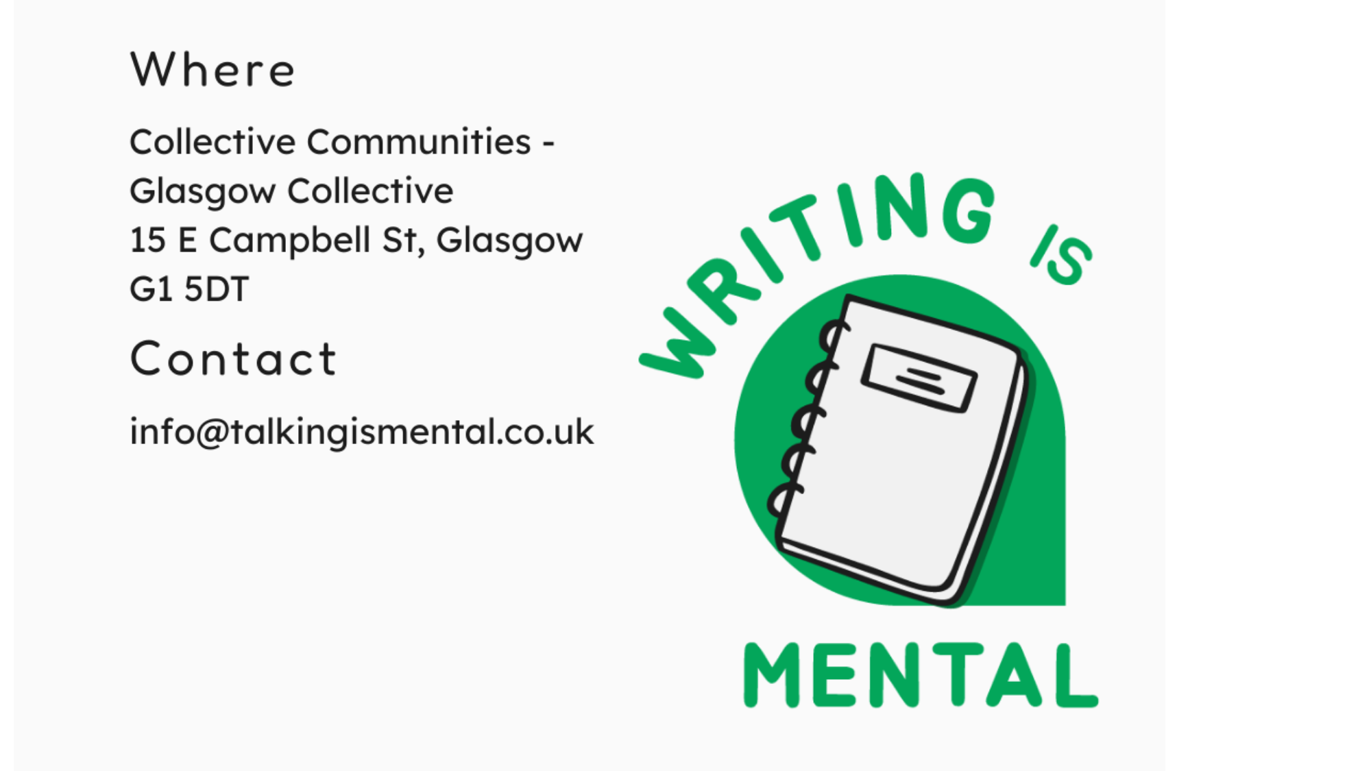 Writing is Mental is hosted by Talking is Mental. Talking is Mental is combating social isolation and loneliness by delivering free activity groups and encouraging conversation around the impact of these issues on physical and mental health.