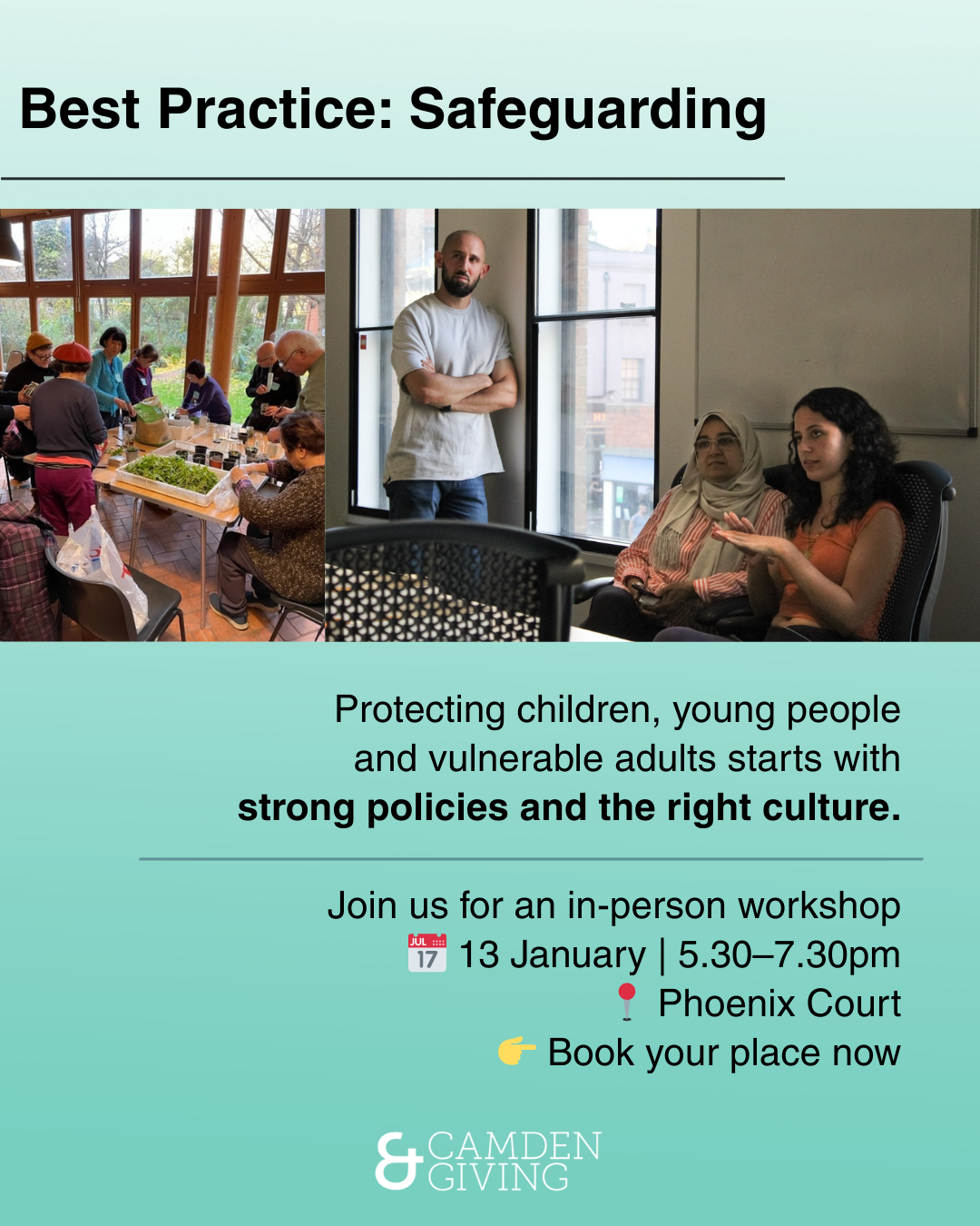 Join Camden Giving for a Best Practice Workshop focused on developing safeguarding policies that not only meet compliance requirements but also promote a strong, proactive safeguarding culture. This workshop is ideal for anyone responsible for safeguarding within their organisation.