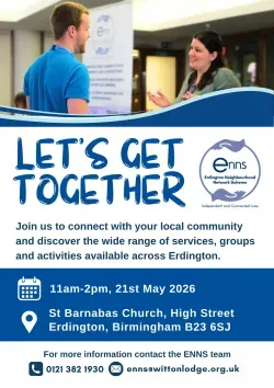 Erdington Neighbourhood Network Scheme will be holding their annual networking event Let's Get Together at St Barnabas Church, B23 6SY on Thursday 21st May 11am-2pm